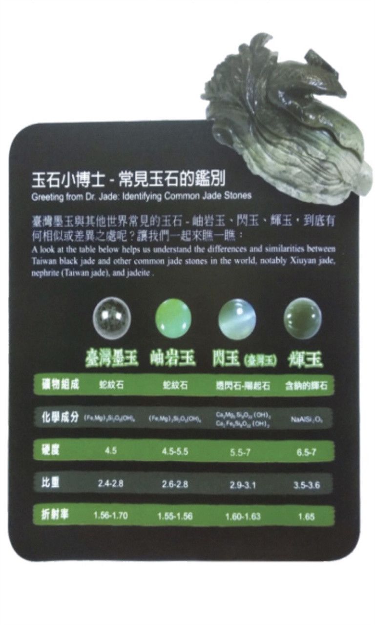 臺灣花蓮至臺東間之花東縱谷,為菲律賓海板塊與歐亞板塊的隱沒 碰撞帶,在此地區的岩石產生變質、火成沉積岩層等各種不同的地質作用,形成了玫瑰石、臺灣玉、臺灣藍寶、紫玉髓等玉石及金銅礦、石棉礦、大理岩礦和蛇紋岩礦等礦床,所以花東地區向有 「地質天堂」、「玉石故鄉」之美譽。 臺灣的玉石業者在經濟部礦務局的協助下,開發出一種新品 種黑色的玉石-市場上稱為「臺灣墨玉」,此種玉石常與世界聞名的臺灣玉共生, 臺博館特別以「玉」的文化與歷史談起, 進而介紹玉石的分類與礦物學特性,希望帶領 國人回顧已有高知名度的臺灣玉。